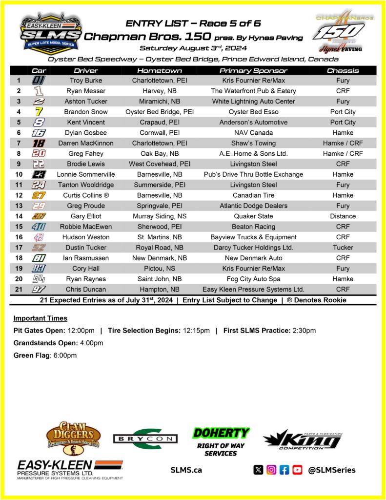 For more information on the Chapman Bros. 150 presented by Hynes Paving, check out Oyster Bed Speedway on Facebook, and online at oysterbedspeedwaypei.com.