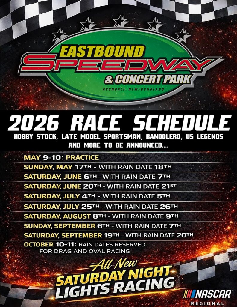 Eastbound Speedway in Avondale, Newfoundland has released their 2026 schedule. Celebrating their 10th season as a part of the NASCAR Regional and Home Tracks program, the schedule will kick off on the Victoria Day Long Weekend with action on Sunday, May 17th and conclude on Saturday, September 19th.